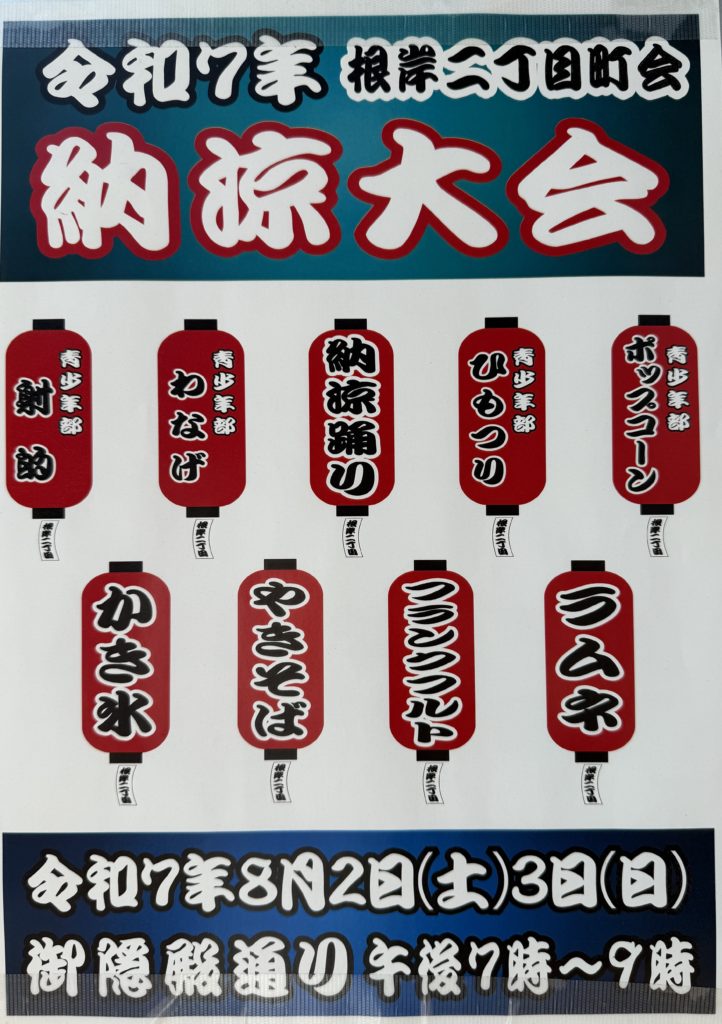 根岸二丁目町会【納涼大会】のお知らせ開催日:2025年8月2日(土)〜8月3日(日)時間:午後7時〜9時場所:御隠殿通り(防災用根岸職員住宅前) 昨年の様子はこちらをご覧ください↓令和6年度 納涼大会 カテゴリー: newsPrevious Post:2025年 元三島神社大祭Next Post:令和7年度 納涼大会